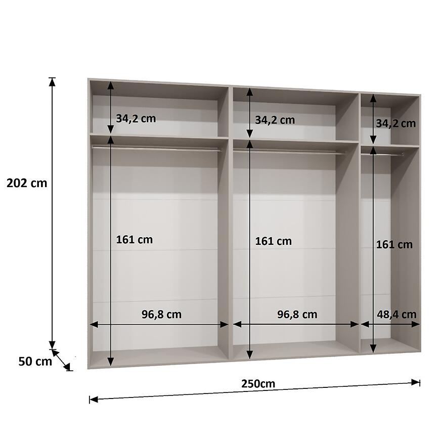 Szerokość 250 cm, wysokość 202 cm i głębokość 52 cm zapewniają wystarczającą przestrzeń do przechowywania ubrań, pościeli i akcesoriów. Kilkudrzwiowa forma umożliwia wygodny dostęp do wszystkich segmentów oraz logiczny podział wnętrza szafy, co ułatwia utrzymanie porządku.