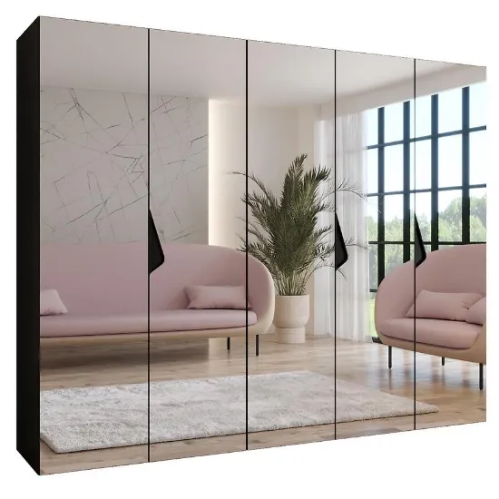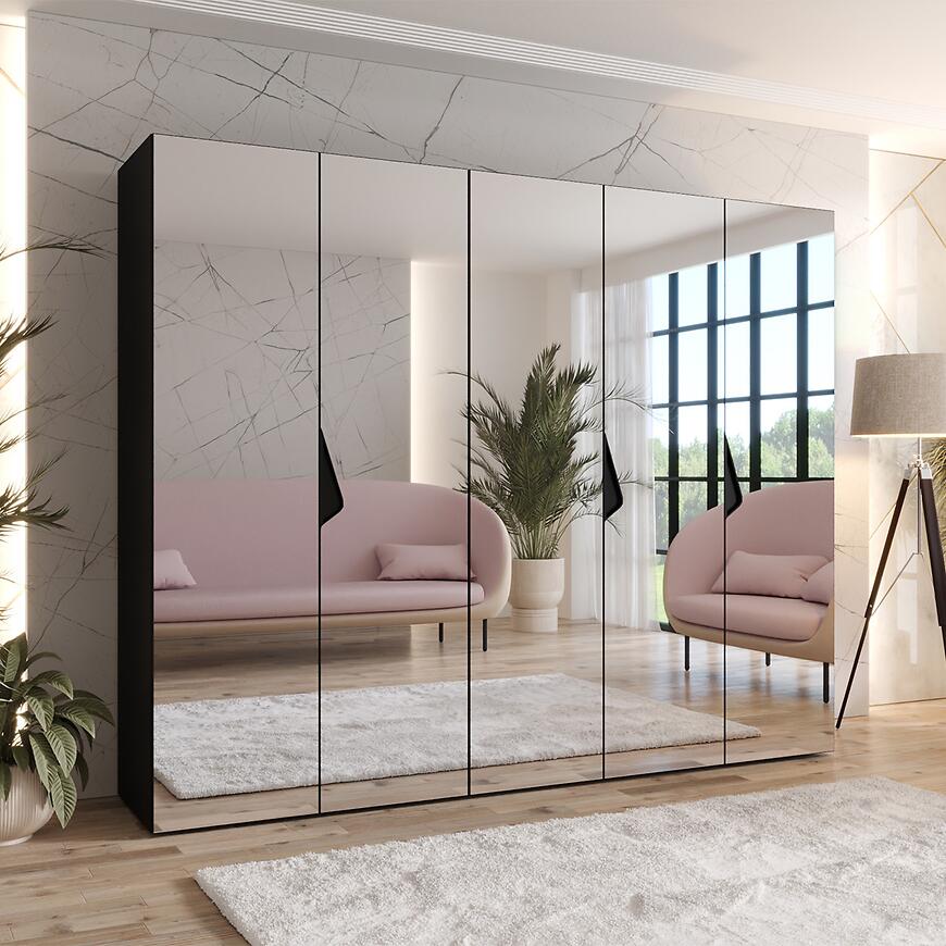 Szafa Sandi 3-250 czarny/czarny – nowoczesna kilkudrzwiowa szafa z lustrem, 250 cm szerokości. Połyskujące czarne fronty, matowy korpus, elegancka, przestronna i funkcjonalna.