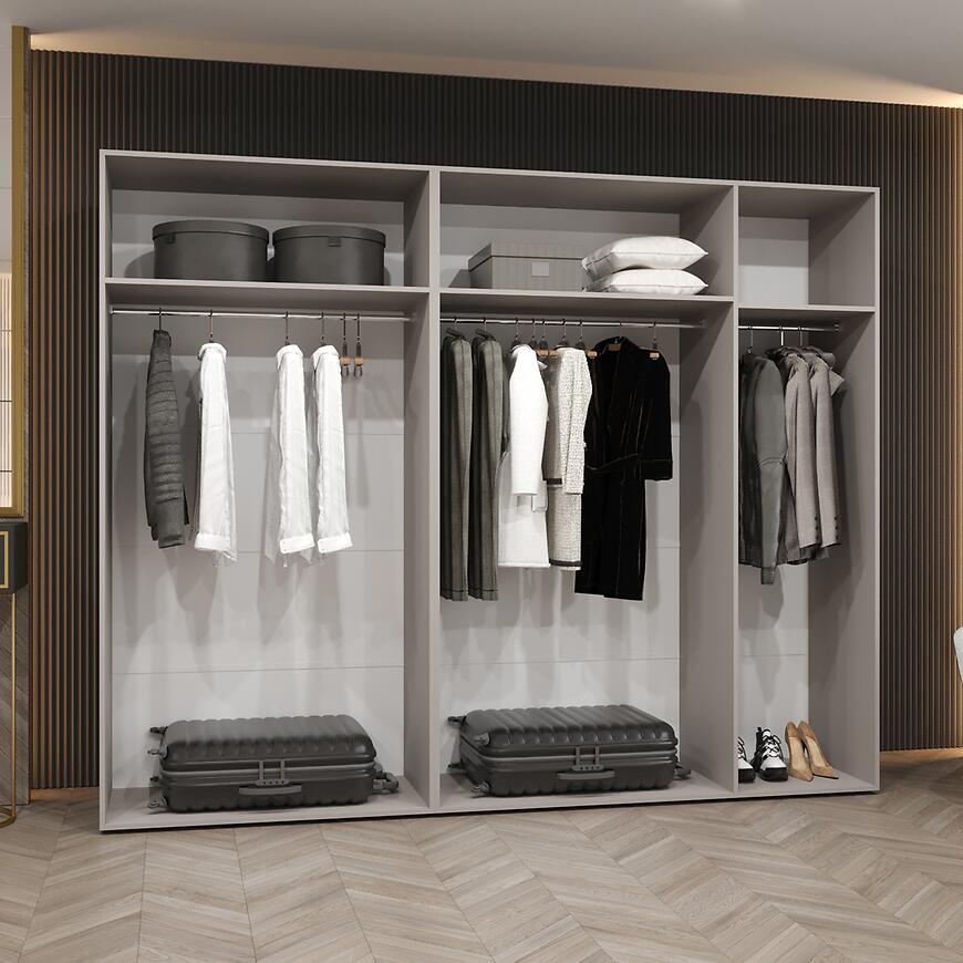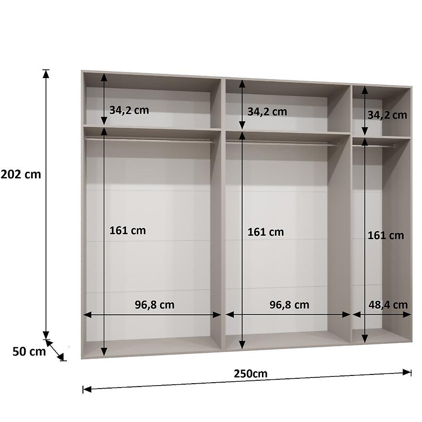 Szerokość 250 cm, wysokość 202 cm i głębokość 52 cm zapewniają przestronne miejsce do przechowywania ubrań i dodatków. Kilkudrzwiowa konstrukcja umożliwia wygodny dostęp do wszystkich segmentów oraz logiczny podział wnętrza, co ułatwia utrzymanie porządku i organizację.