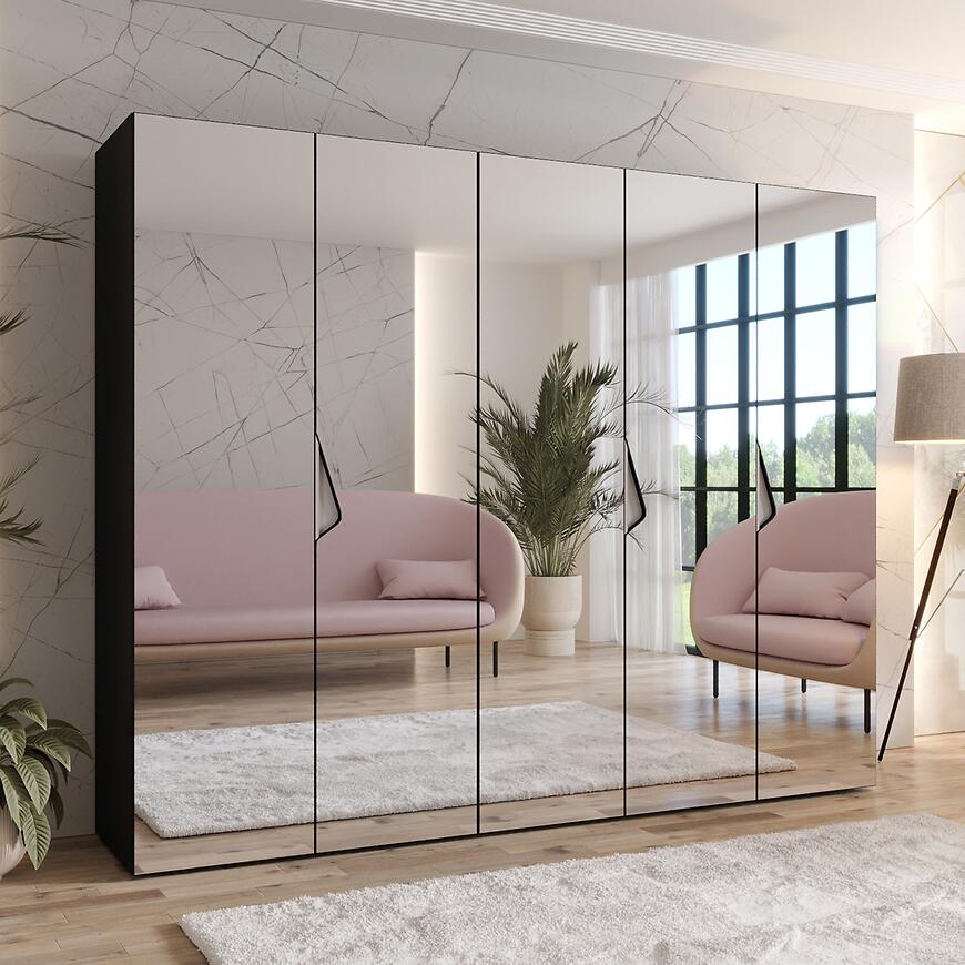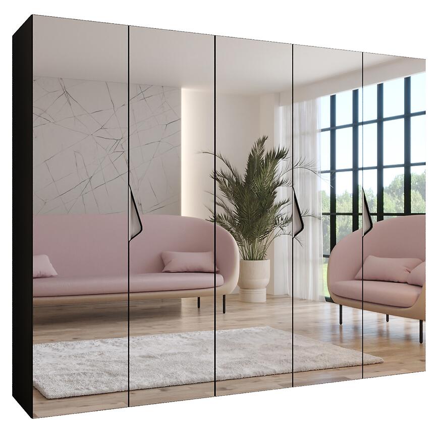 Szafa Sandi 3-250 czarny/kaszmir – nowoczesna kilkudrzwiowa szafa z lustrem, 250 cm szerokości. Połyskujące czarne fronty z kaszmirowym akcentem, matowy korpus, elegancka i funkcjonalna.