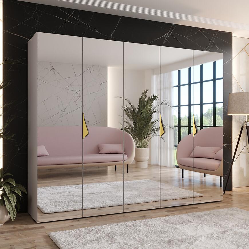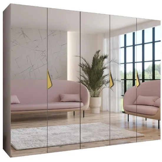 Szafa Sandi 3-250 kaszmir/złoty łączy subtelny beż kaszmir z eleganckim złotym detalem, tworząc stylowy i nowoczesny mebel. Kilkudrzwiowa konstrukcja z wbudowanym lustrem optycznie powiększa przestrzeń i ułatwia organizację przechowywanych rzeczy, zwiększając wygodę codziennego użytkowania.