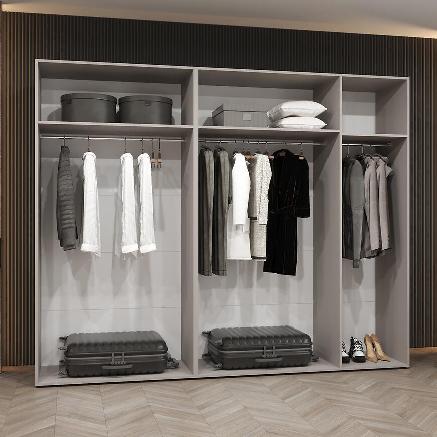 Szerokość 250 cm, wysokość 202 cm i głębokość 52 cm zapewniają dużą powierzchnię do przechowywania ubrań, pościeli i akcesoriów. Kilkudrzwiowa forma umożliwia wygodny dostęp do wszystkich segmentów i logiczny podział wnętrza szafy, co pozwala utrzymać porządek i funkcjonalność.