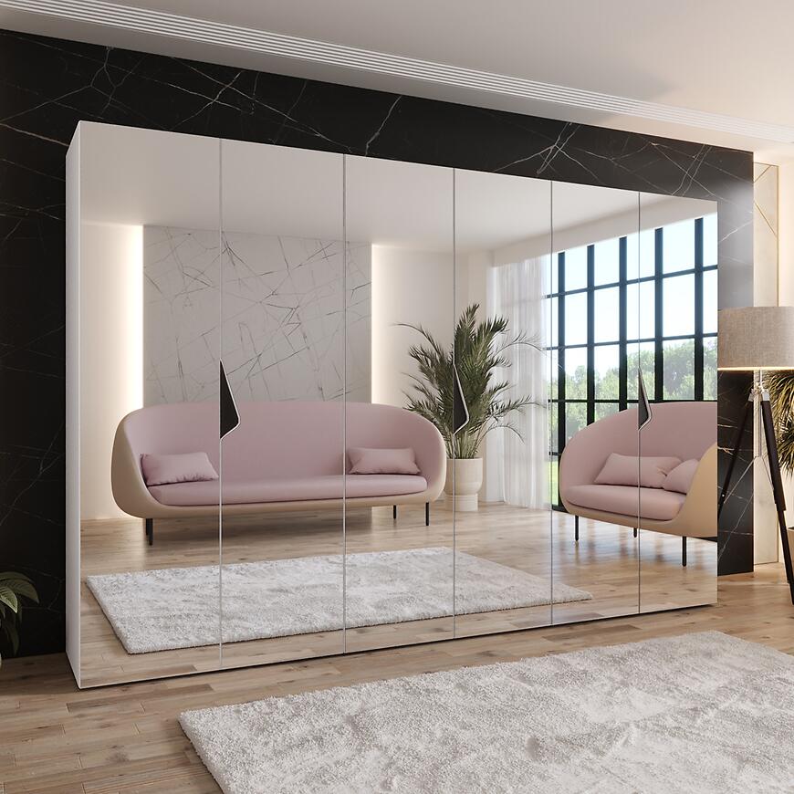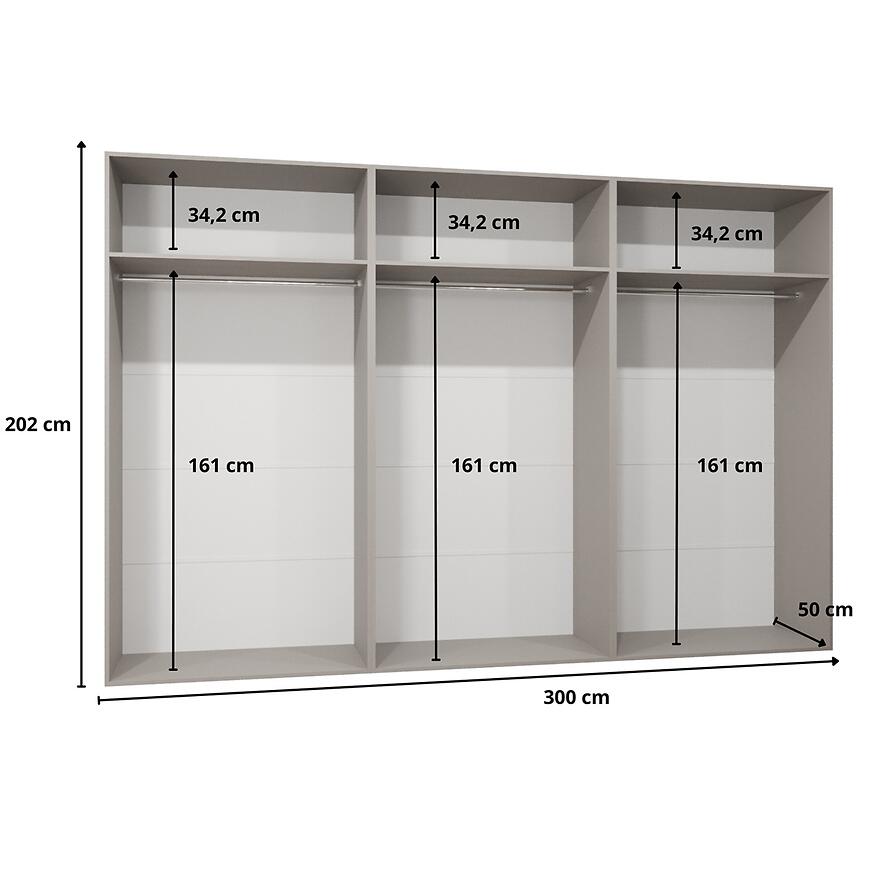 Szafa Sandi 3-300 (3x100) w wybarwieniu biały/czarny to funkcjonalny mebel o szerokości 300 cm, zapewniający dużą powierzchnię do przechowywania. Klasyczne, kilkudrzwiowe fronty z lustrem ułatwiają użytkowanie i dodają bryle lekkości.