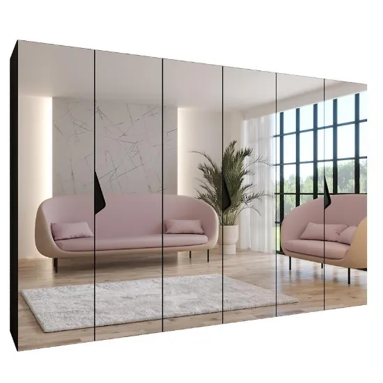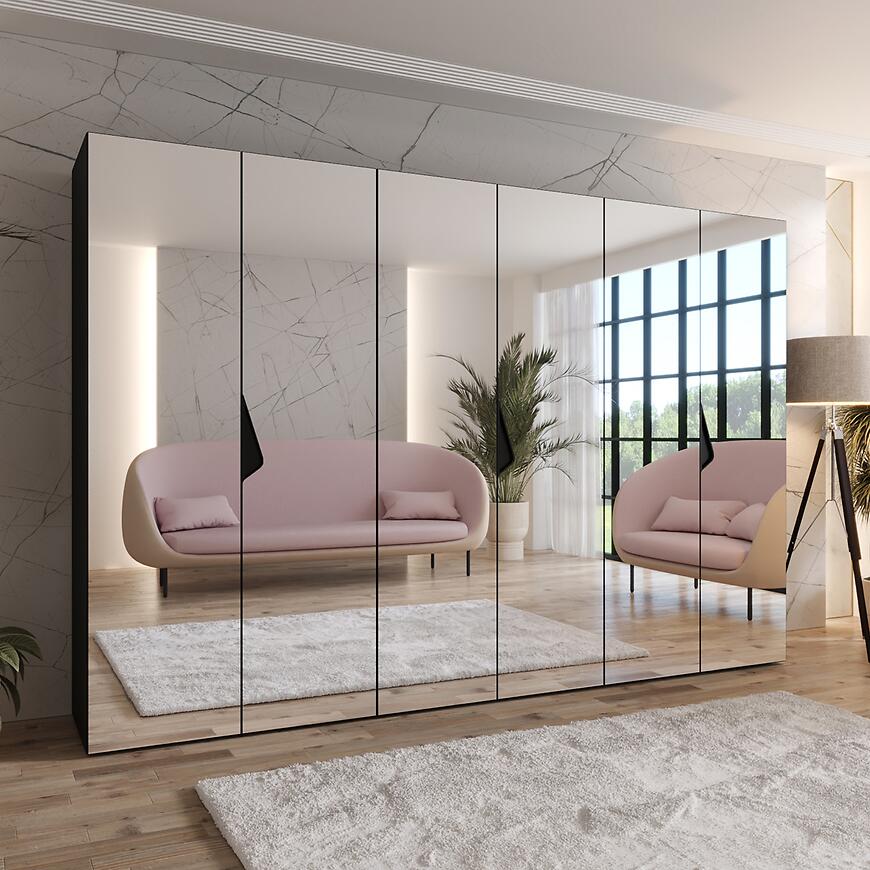 Szafa Sandi 3-300 czarny/czarny – nowoczesna kilkudrzwiowa szafa z lustrem, 300 cm szerokości. Połyskujące czarne fronty, matowy korpus, przestronna i stylowa, idealna do nowoczesnych wnętrz.