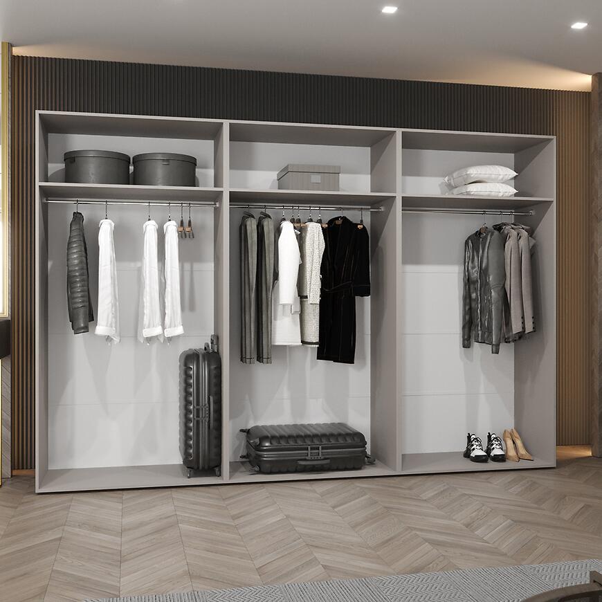 Szerokość 300 cm, wysokość 202 cm i głębokość 52 cm gwarantują dużą powierzchnię do przechowywania ubrań, dodatków i akcesoriów. Kilkudrzwiowa forma umożliwia wygodny dostęp do wszystkich segmentów oraz logiczne rozmieszczenie wnętrza szafy.