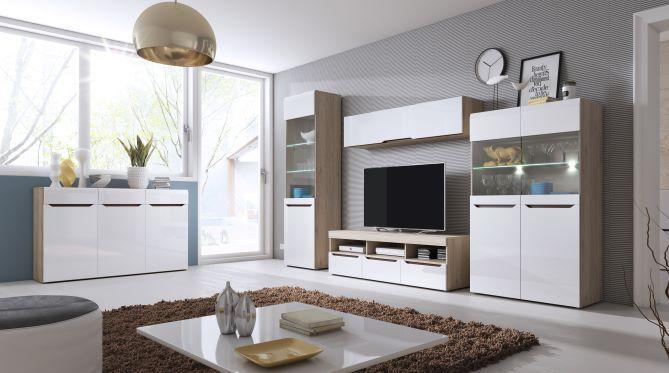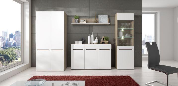 Nowoczesna kolekcja Sanremo to propozycja dla miłośników minimalizmu, którzy cenią sobie również funkcjonalność. Korpus w kolorze jasnego drewna oraz front biały połysk wykonano z płyty MDF zawierającej włókna drzewne. Kompozycja tych dwóch barw - bieli i jasnego drewna - wprowadzi do pomieszczenia powiew natury. Możliwość zamontowania dodatkowego oświetlenia LED jest odpowiednim rozwiązaniem dla osób, które chcą wyeksponować znajdujące się na półkach przedmioty. Kolekcja Sanremo szczególnie dobrze zaprezentuje się w jasnych pomieszczeniach urządzonych w stylu skandynawskim.