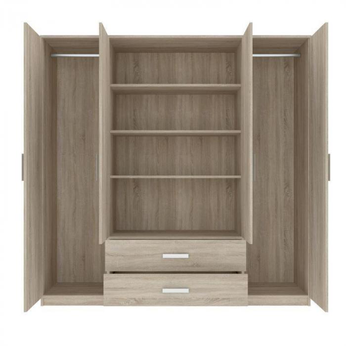 Szafa na ubrania z kolekcji Saravena 4D2S z uchylnymi drzwiami to praktyczny mebel do sypialni, pokoju dziennego czy przedpokoju. Szafa sprawdzi się również w innym pomieszczeniu. Kolor mebla dąb sonoma wpasuje się w wiele aranżacji. Będzie pasowała do wnętrz klasycznych jak również do wnętrz nowoczesnych - szafa z pewnością sprawdzi się w każdym pomieszczeniu. Saravena to pojemna szafa z lustrem, czterodrzwiowa. Lustra znajdują się na środkowych drzwiach nad dwoma szufladami. Mebel posiada w komplecie dwa drążki do wieszania ubrań, na którym powiesisz nawet długie ubrania. Uchwyty wykonane są z tworzywa w kolorze srebrnym. Płyta z której wykonano szafę to płyta laminowana.