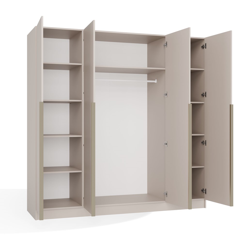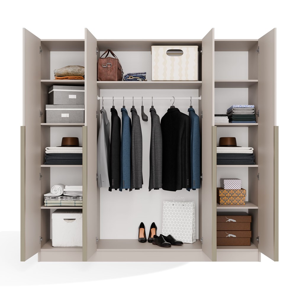 Szafa Sensory to funkcjonalny i elegancki mebel, który doskonale sprawdzi się w każdej nowoczesnej sypialni, garderobie czy przedpokoju. Jej 4-drzwiowa konstrukcja zapewnia wygodny dostęp do całego wnętrza, które zostało starannie zaprojektowane z myślą o maksymalnym wykorzystaniu przestrzeni. Dużo pojemnych półek umożliwia przechowywanie ubrań, pościeli, pudełek i wszelkich dodatków, a wysoka komora z drążkiem to idealne miejsce na wieszaki z dłuższą odzieżą, taką jak płaszcze czy sukienki.