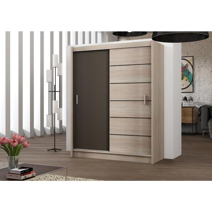 Szafa z drzwiami przesuwnymi w kolorze dąb sonoma/lava z serii Sevilla to doskonała propozycja do pokoju dziennego, ale znajdzie swoje miejsce również w innym pomieszczeniu, jak na przykład - przedpokój czy garderobie, sypialni. Materiał wykonania to płyta laminowana. Szafa posiada półkę i drążek na ubrania. Wygląd szafy sprawi, że wpasuje się w większość aranżacji. Szafa będzie świetnym miejscem do wieszania ubrań. Nowoczesny styl mebli wpadnie do gustu każdemu, kto poszukuje eleganckiego, klasycznego, a zarazem nowoczesnego umeblowania. Szafa przeznaczona do samodzielnego montażu.