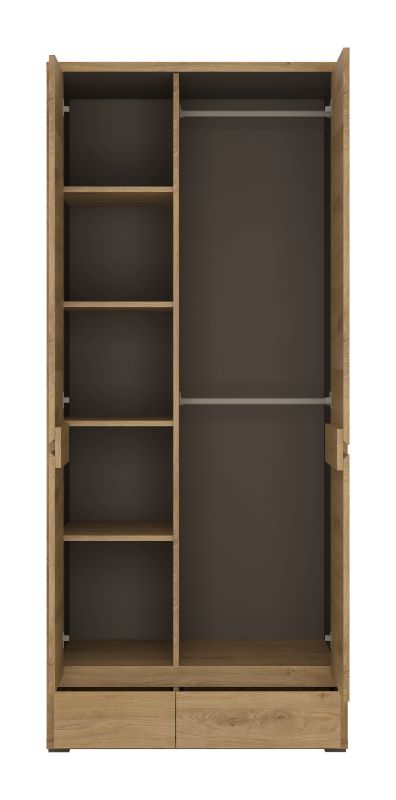 Wnętrze szafy zostało zaprojektowane tak, aby pomieścić jak najwięcej elementów garderoby na stosunkowo niewielkiej powierzchni. W środku znajduje się przestrzeń z drążkiem na wieszaki, która idealnie nadaje się do przechowywania płaszczy, kurtek, koszul czy sukienek. Obok umieszczono półki różnej wielkości, na których bez trudu zmieścisz poskładane ubrania, swetry, torby czy akcesoria sezonowe. Dodatkowo na dole znajdują się dwie pojemne szuflady, idealne do przechowywania bielizny, dodatków lub mniejszych elementów garderoby.