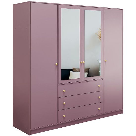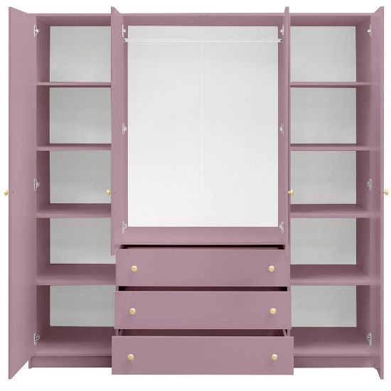 Wykonana z płyty wiórowej laminowanej o matowym wykończeniu, szafa Siena zapewnia trwałość i stabilność, co gwarantuje jej długotrwałą użytkowanie. Czterodrzwiowe drzwi uchylne ułatwiają dostęp do wnętrza, które zostało wyposażone w praktyczne rozwiązania, takie jak lustro, umieszczone na drzwiach, oraz trzy szuflady, półki i drążek na ubrania.