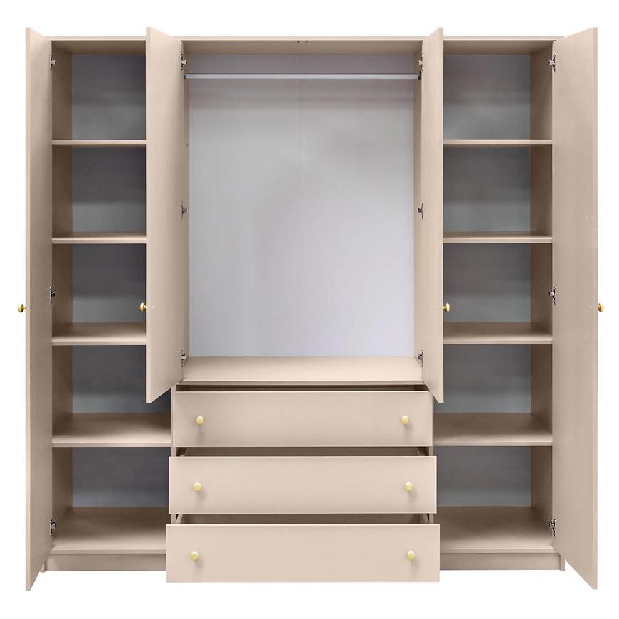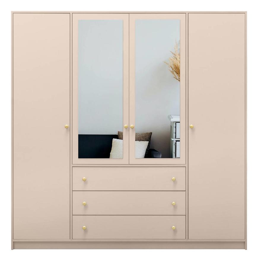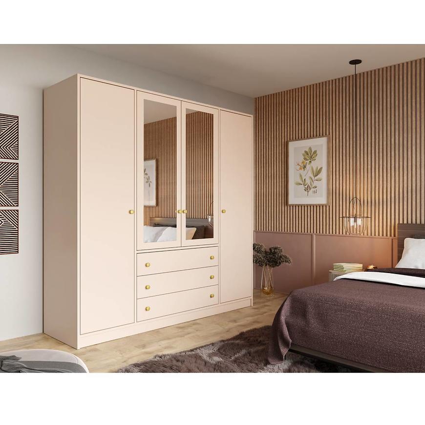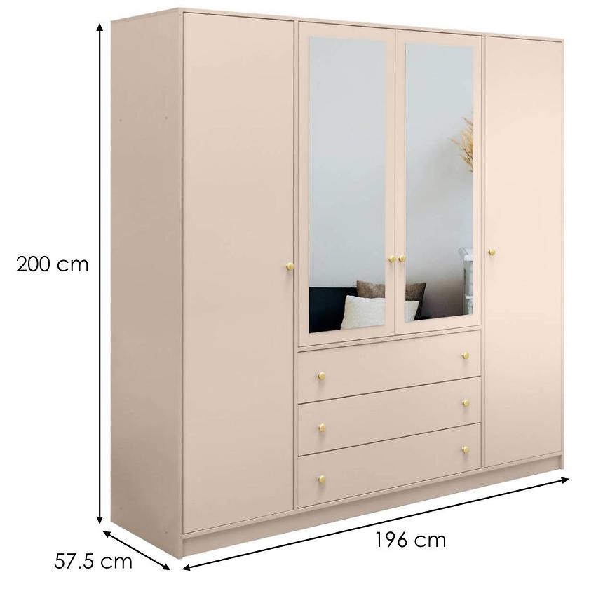 Wykonana z płyty wiórowej laminowanej o matowym wykończeniu, szafa Siena zapewnia trwałość i stabilność, co gwarantuje jej długotrwałą użytkowanie. Czterodrzwiowe drzwi uchylne ułatwiają dostęp do wnętrza, które zostało wyposażone w praktyczne rozwiązania, takie jak lustro, umieszczone na drzwiach, oraz trzy szuflady, półki i drążek na ubrania.
