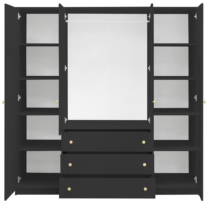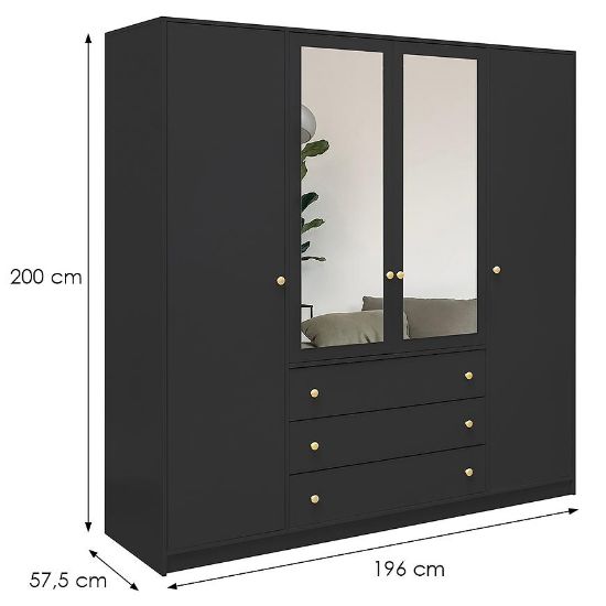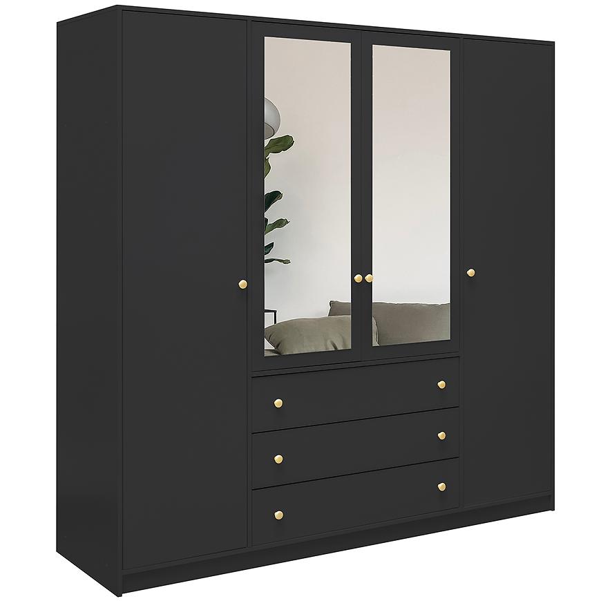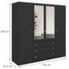 Wykonana z płyty wiórowej laminowanej o matowym wykończeniu, szafa Siena zapewnia trwałość i stabilność, co gwarantuje jej długotrwałą użytkowanie. Czterodrzwiowe drzwi uchylne ułatwiają dostęp do wnętrza, które zostało wyposażone w praktyczne rozwiązania, takie jak lustro, umieszczone na drzwiach, oraz trzy szuflady, półki i drążek na ubrania.