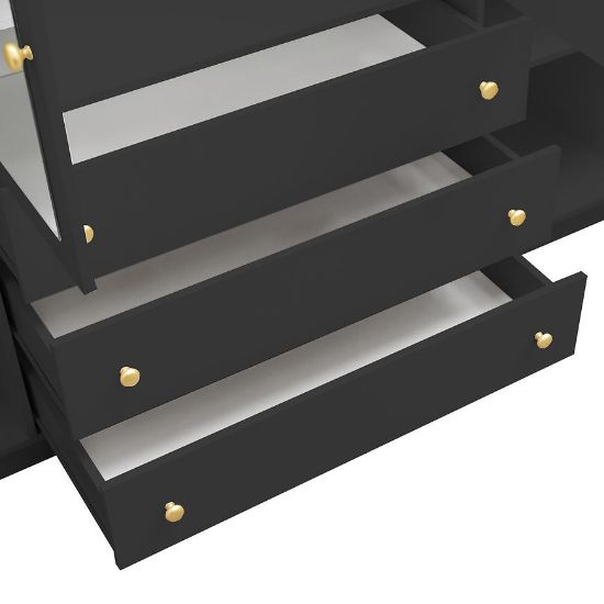 Lustro na drzwiach szafy nie tylko dodaje jej elegancji, ale również stanowi praktyczne rozwiązanie do szybkiego sprawdzenia wyglądu przed wyjściem. Szuflady oraz półki i drążek na ubrania pozwalają na zachowanie porządku wewnątrz szafy, co ułatwia organizację przestrzeni.