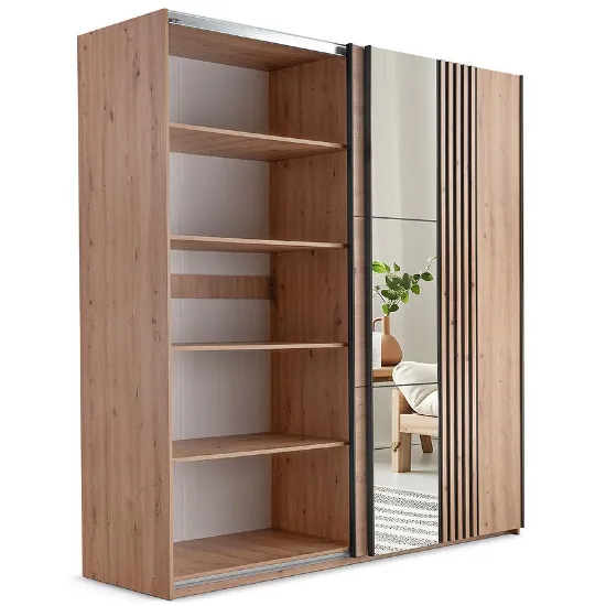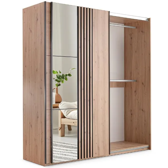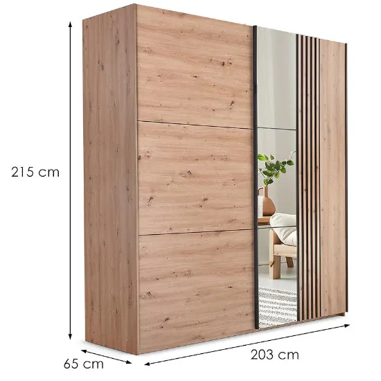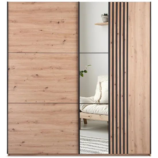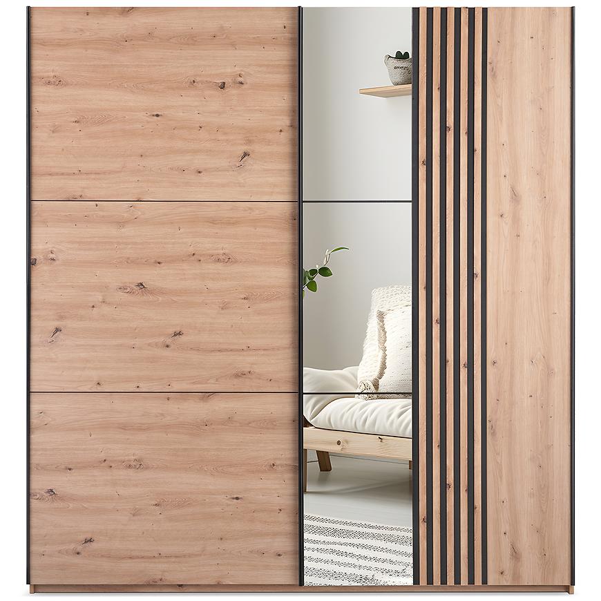 Szafa Sintra 203 Artisan / Lustro to elegancka i funkcjonalna propozycja, która łączy nowoczesny design z praktycznym rozwiązaniem. Wykonana w kolorze Dąb Artisan, z dodatkiem lustra, szafa wprowadza do wnętrza subtelną elegancję i optycznie je powiększa.