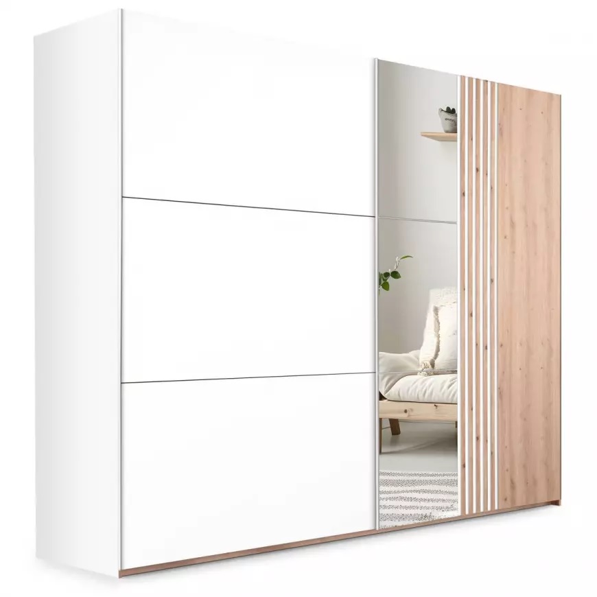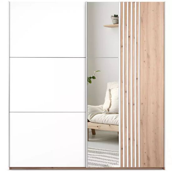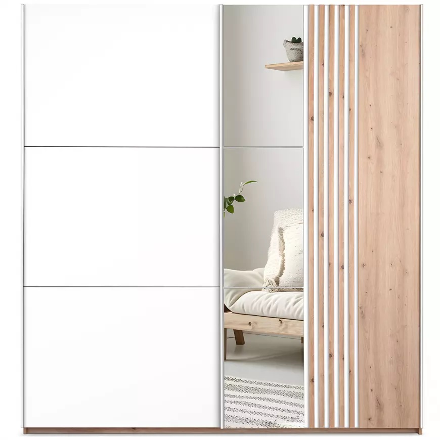 Szafa Sintra 203 to idealne połączenie funkcjonalności i eleganckiego designu, które doskonale sprawdzi się w sypialni, przedpokoju czy garderobie. Dzięki dwudrzwiowej konstrukcji z przesuwnymi drzwiami oraz lustrem, szafa oferuje dużo miejsca do przechowywania, jednocześnie optycznie powiększając przestrzeń.