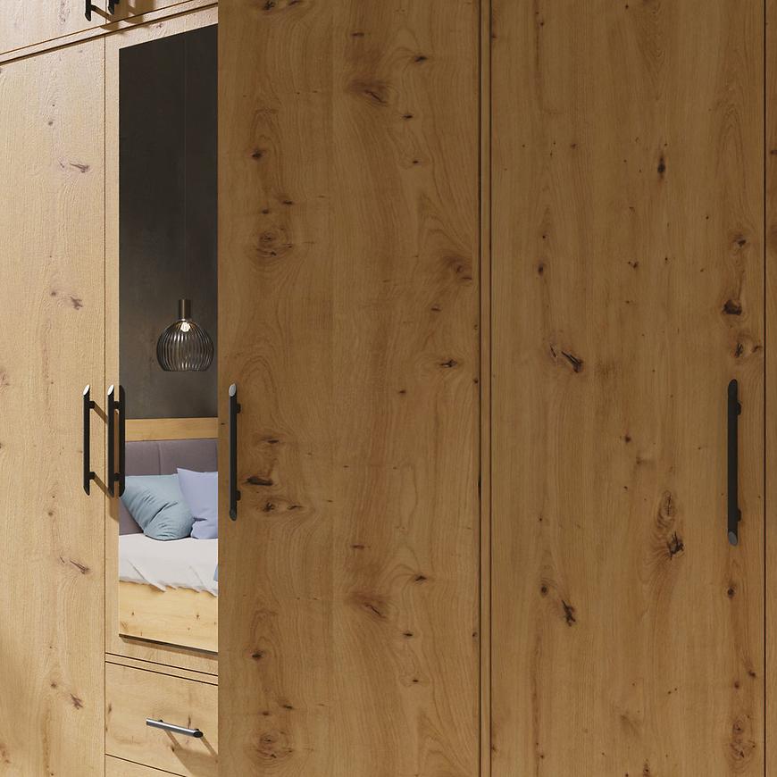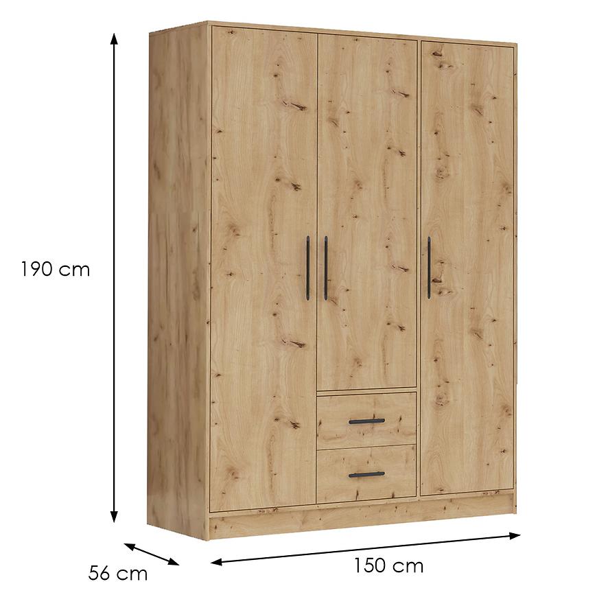 Jej prosta forma, klasyczne trzydrzwiowe skrzydła oraz eleganckie jasne drewnopodobne wybarwienie w kolorze dąb artisan nadają szafie lekkości i subtelnego uroku. Matowe wykończenie frontów i korpusu, oparte na solidnej konstrukcji z płyty wiórowej laminowanej, nadaje meblowi nowoczesnego charakteru.