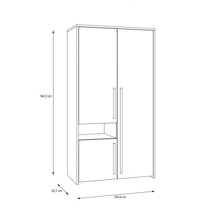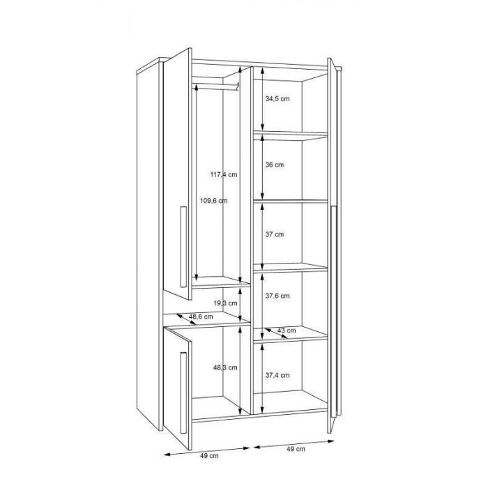Jej wnętrze kryje drążek do wieszania ubrań oraz cztery półki które pomogą poskromić nieład w pokoju każdego nastolatka. Mebel wykonano z wysokiej jakości płyty wiórowej, wykończony folią finish. Uchwyty w kolorze dąb catania wykonane z płyty MDF. Maksymalne obciążenie drążka na ubrania to 15 kg, półek 5 kg.