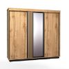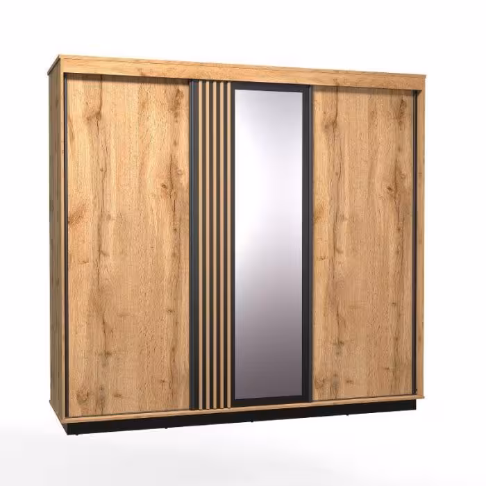 Szafa trzydrzwiowa z lustrem Sole LA19 to doskonała propozycja do sypialni. Korpus systemu wykonany jest w kolorze dąb wotan, natomiast fronty to połączenie dąb wotan z czarnym matem, które doskonale ze sobą współgrają. Część frontów otwierana jest bezuchwytowo, a część posiada uchwyty wykonane z materiału PCV. Połączenie pionowych listew z frontami mebli to nowoczesne i szykowne zestawienie. Meble Sole charakteryzują nowoczesnym i eleganckim designem. Wniosą do każdego wnętrza ciekawy wygląd, który zachwyci każdego.