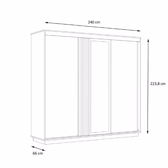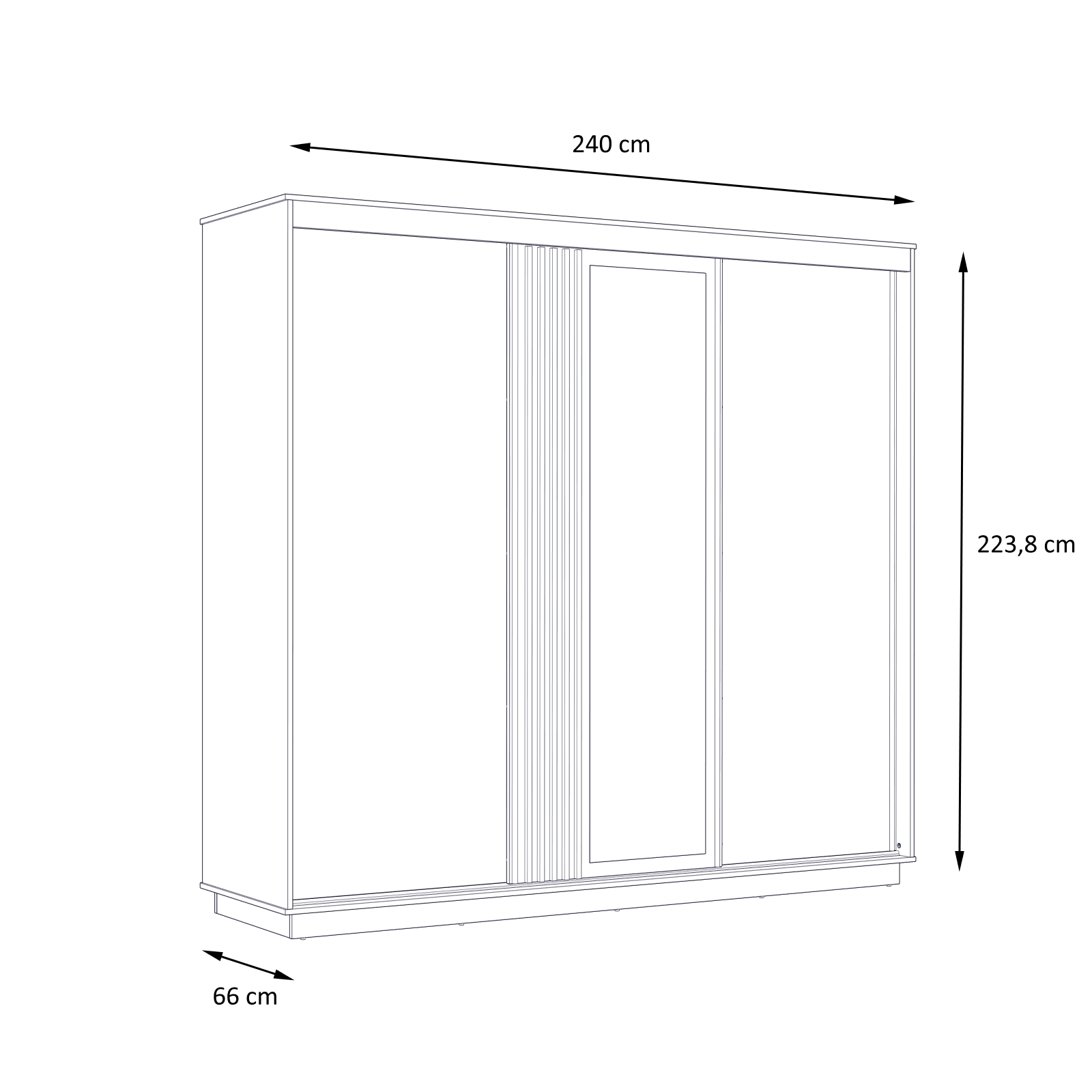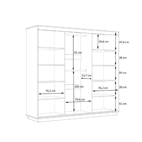Jej wnętrze szafy kryje dwa drążki do wieszania ubrań o różnej długości oraz dwie górne półki które pomogą poskromić nieład w sypialni. W bocznej części znajduje się dodatkowo siedem półek. Szafa Sole posiada dwie szuflady znajdujące się w środkowej części pod lustrem. Mebel wykonano z wysokiej jakości płyty laminowanej. Lamele zastosowane na frontach wykonano z płyty MDF.