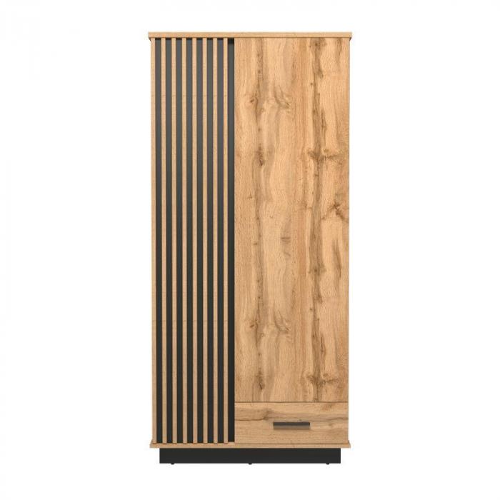 Wygląd szafy Sole LA1 zachwyci każdego zwolennika eleganckiego, a zarazem ciekawego stylu. Szafa posiada wystarczającą ilość miejsca na ubrania oraz na inne przedmioty. Jest to niezbędny element wyposażenia w każdym domu, garderobie czy przedpokoju. Materiał wykonania to płyta laminowana + lamele z MDF.