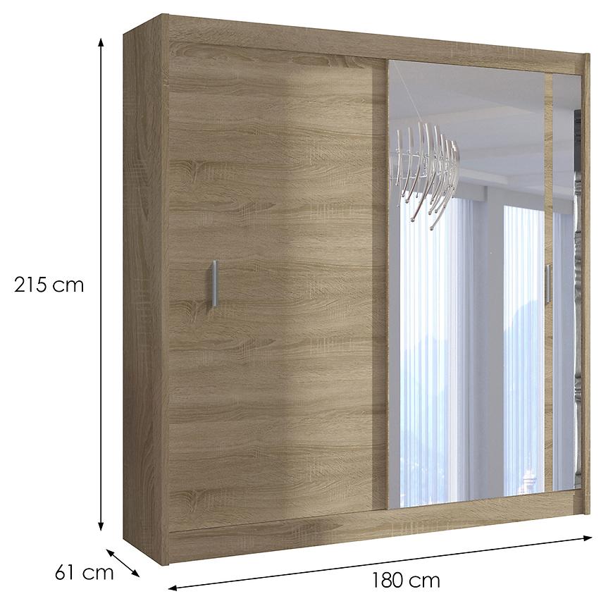 Szafa Solo 180 w kolorze dąb sonoma to elegancki i funkcjonalny mebel, który doskonale wpasuje się w nowoczesne wnętrza. Jej imponujące wymiary (szerokość 180 cm, wysokość 215 cm, głębokość 61 cm) zapewniają dużą przestrzeń do przechowywania ubrań i innych przedmiotów. Dzięki dwudrzwiowej konstrukcji z drzwiami przesuwnymi, szafa nie tylko prezentuje się stylowo, ale także jest praktyczna – idealna do pomieszczeń, gdzie oszczędność miejsca jest priorytetem.