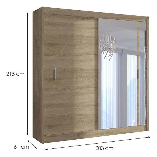 Szafa Solo 203 w kolorze dąb sonoma to elegancki i funkcjonalny mebel, który doskonale wpasuje się w nowoczesne wnętrza. Jej imponujące wymiary (szerokość 203 cm, wysokość 215 cm, głębokość 61 cm) zapewniają dużą przestrzeń do przechowywania ubrań i innych przedmiotów. Dzięki dwudrzwiowej konstrukcji z drzwiami przesuwnymi, szafa nie tylko prezentuje się stylowo, ale także jest praktyczna – idealna do pomieszczeń, gdzie oszczędność miejsca jest priorytetem.