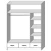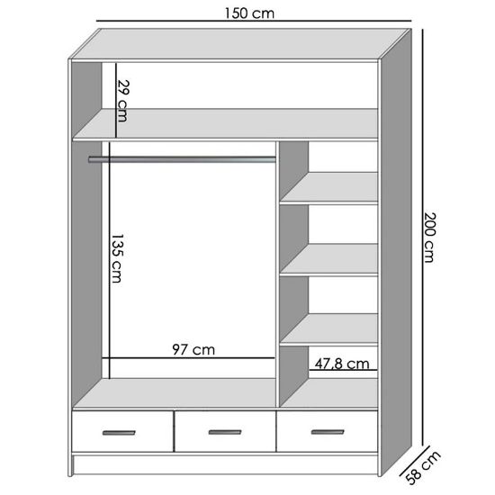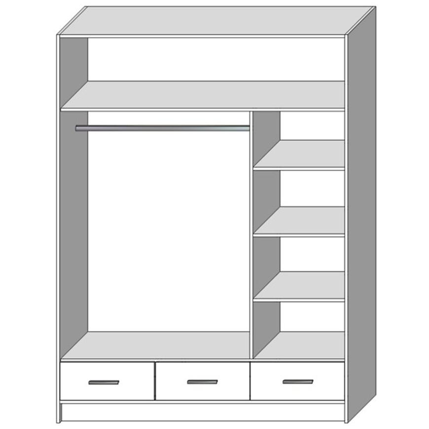 Szafa Sophie 150 oferuje dobrze zorganizowane wnętrze, w którym znajdziesz zarówno półki, jak i drążek na ubrania. Dzięki temu możesz łatwo posegregować odzież, zapewniając sobie łatwy dostęp do wszystkich potrzebnych rzeczy. Dodatkowe trzy szuflady stanowią praktyczne miejsce na mniejsze elementy garderoby lub inne przedmioty, które chcesz mieć pod ręką, ale nie na widoku.