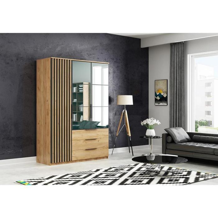 Szafa uchylna Sorento to propozycja do pokoju dziennego, ale znajdzie swoje miejsce również w innym pomieszczeniu, jak na przykład - przedpokój czy garderobie. Materiał wykonania to płyta wiórowa laminowana. Szafa posiada półki, szuflady oraz drążek na ubrania. Mebel posiada lustro, które sprawi, że pomieszczenie stanie się optycznie większe. Nowoczesny styl mebli wpadnie do gustu każdemu, kto poszukuje eleganckiego, klasycznego, a zarazem nowoczesnego umeblowania. Idealnie wpasuje się w większość aranżacji. Przeznaczona do samodzielnego montażu.