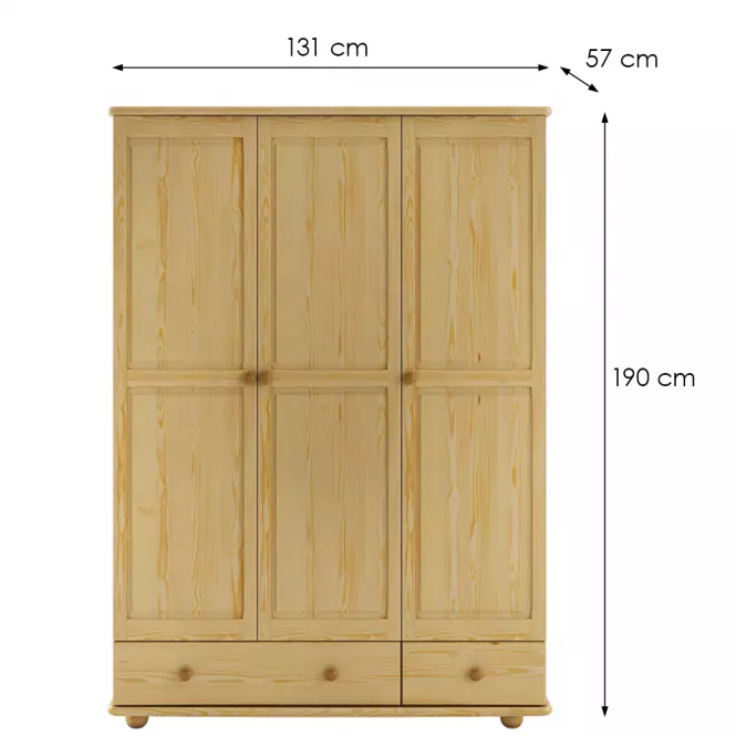 Wykonana w całości z wytrzymałego drewna sosnowego, zarówno fronty, jak i korpus szafy zachowują naturalny, jasny wygląd z matowym wykończeniem. Takie rozwiązanie nie tylko podkreśla wyjątkowy charakter naturalnego materiału, ale również dodaje wnętrzu przytulności i ciepła. Szafa jest solidnie zbudowana, co gwarantuje jej trwałość i wytrzymałość na lata, idealnie odpowiadając na potrzeby przechowywania w domowych wnętrzach.