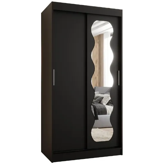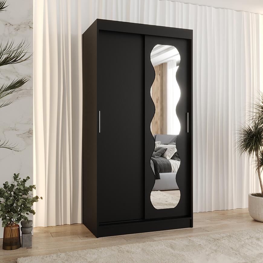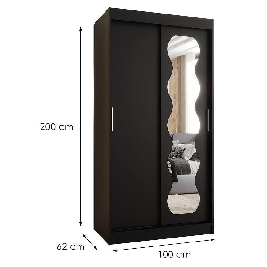 Szafa Spoti 100 czarny to idealny wybór dla osób poszukujących praktycznej, dwudrzwiowej szafy przesuwnej z lustrem w wyrazistym czarnym wykończeniu. Sprawdzi się jako mebel do mniejszych sypialni lub garderoby, wprowadzając do wnętrza elegancję, porządek i nowoczesny charakter.
