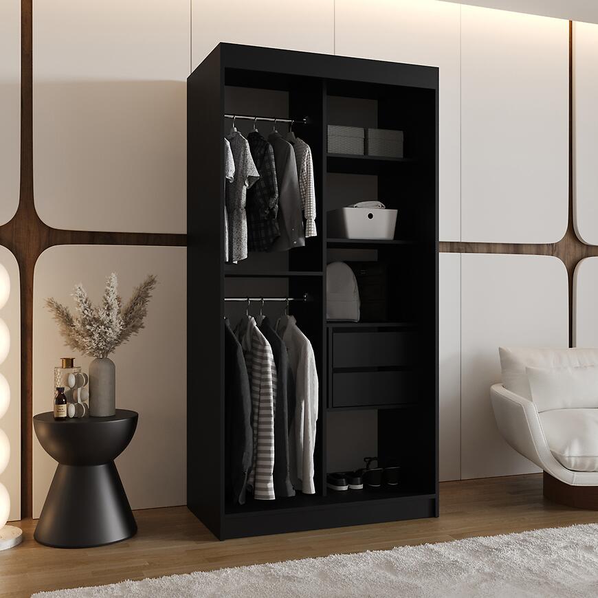 Szafa Spoti 100 czarny to elegancki i funkcjonalny mebel, który doskonale sprawdzi się w mniejszych sypialniach, garderobach oraz przedpokojach. Model z kolekcji SPOTI o szerokości 100 cm zapewnia wygodną przestrzeń do przechowywania ubrań, dodatków i tekstyliów domowych. Głęboki, czarny kolor frontów i korpusu w matowym wykończeniu nadaje wnętrzu wyrazistości i nowoczesnego charakteru, łatwo komponując się z minimalistycznymi i loftowymi aranżacjami.