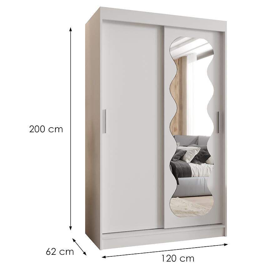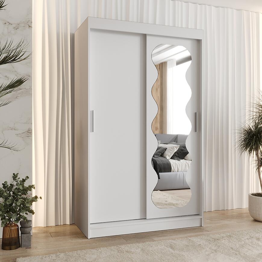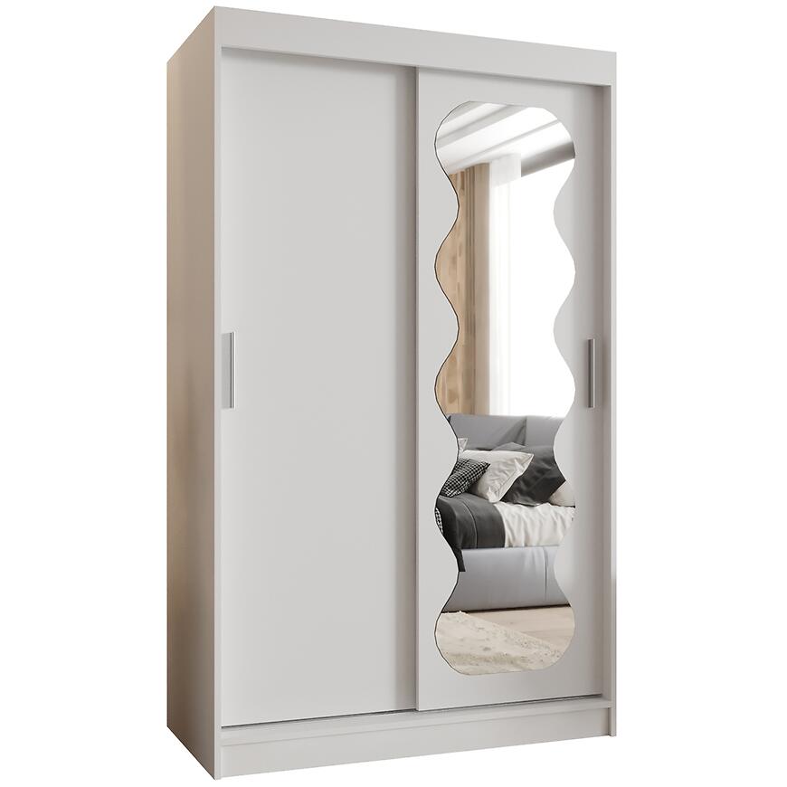 Szafa Spoti 120 biały to idealny wybór dla osób poszukujących praktycznej, dwudrzwiowej szafy przesuwnej z lustrem. Doskonale sprawdzi się jako mebel do sypialni lub garderoby, wprowadzając do wnętrza świeżość, porządek i harmonijną estetykę.