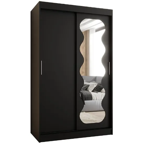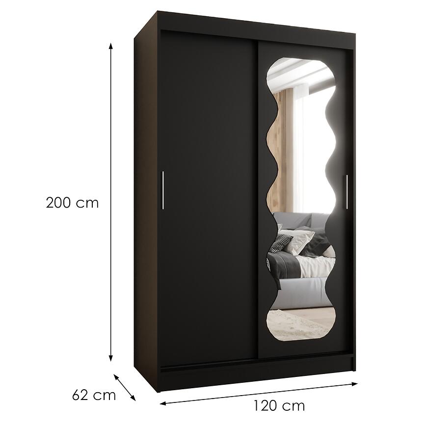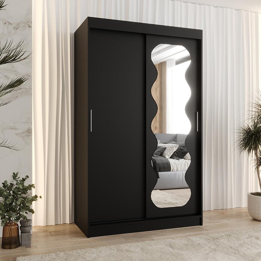 Szafa Spoti 120 czarny to idealny wybór dla osób szukających praktycznej, dwudrzwiowej szafy przesuwnej z lustrem w wyrazistym, czarnym wykończeniu. Doskonale sprawdzi się jako mebel do sypialni lub garderoby, wprowadzając do wnętrza elegancję, porządek i nowoczesny charakter.