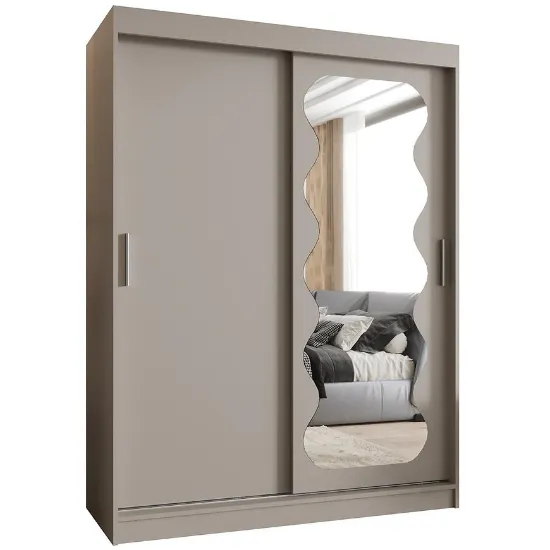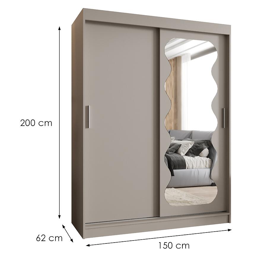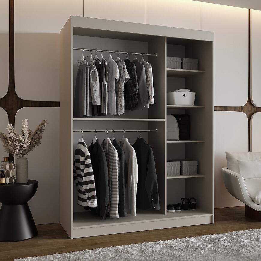 Szafa Spoti 150 kaszmir to idealny wybór dla osób ceniących funkcjonalność, nowoczesny design i delikatną, beżową kolorystykę w sypialni lub garderobie.