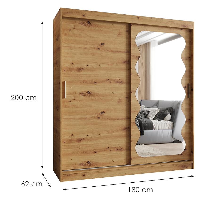 Dwudrzwiowa szafa z drzwiami przesuwnymi oszczędza miejsce, a wbudowane lustro pozwala optycznie powiększyć przestrzeń i ułatwia codzienne przygotowania. Solidna konstrukcja z płyty wiórowej laminowanej gwarantuje trwałość i stabilność mebla.