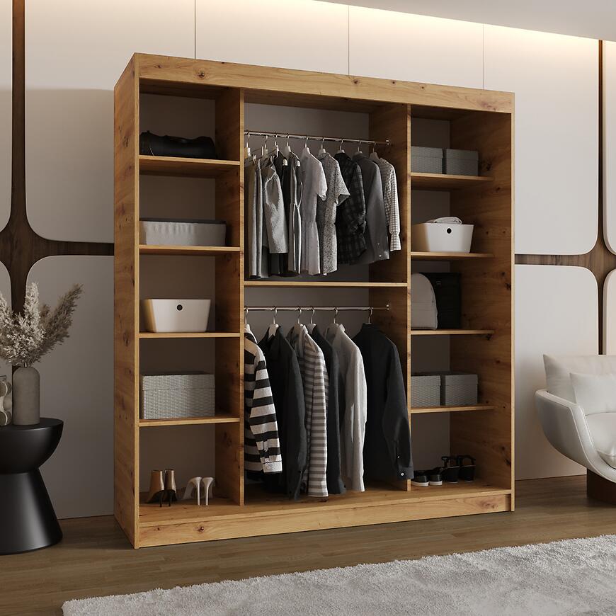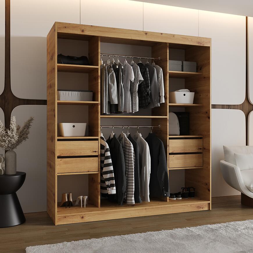 Szafa Spoti 180 artisan to funkcjonalny i stylowy wybór dla osób ceniących naturalne odcienie drewna i przestronność w sypialni lub garderobie.