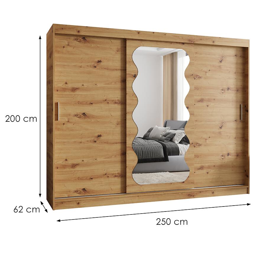 Szafa Spoti 250 w odcieniu artisan to propozycja dla osób ceniących nowoczesny design, przestronność i praktyczne rozwiązania. Trzydrzwiowa konstrukcja z drzwiami przesuwnymi i wbudowanym lustrem pozwala wygodnie przechowywać ubrania, pościel i dodatki, jednocześnie optycznie powiększając pomieszczenie. Jasne drewnopodobne fronty w kolorze artisan nadają wnętrzu naturalnego i przytulnego charakteru.