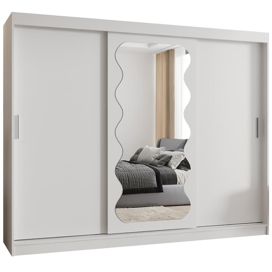 Szafa Spoti 250 w eleganckim, białym wybarwieniu to propozycja dla osób ceniących nowoczesny design i praktyczne rozwiązania w przechowywaniu. Trzydrzwiowa konstrukcja z drzwiami przesuwnymi i wbudowanym lustrem pozwala wygodnie przechowywać ubrania, pościel i dodatki, jednocześnie optycznie powiększając wnętrze.