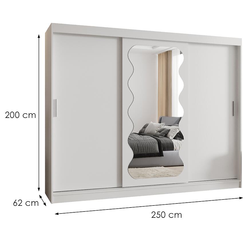 Wymiary 200 cm wysokości, 250 cm szerokości i 62 cm głębokości zapewniają dużą pojemność, a drzwi przesuwne umożliwiają łatwy dostęp nawet w mniejszych pomieszczeniach. Matowe wykończenie frontów i korpusu nadaje szafie nowoczesnego charakteru, a wbudowane lustro zwiększa funkcjonalność.