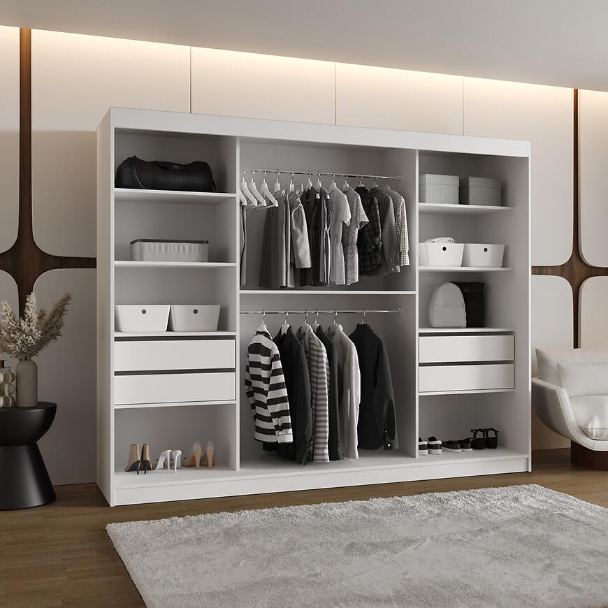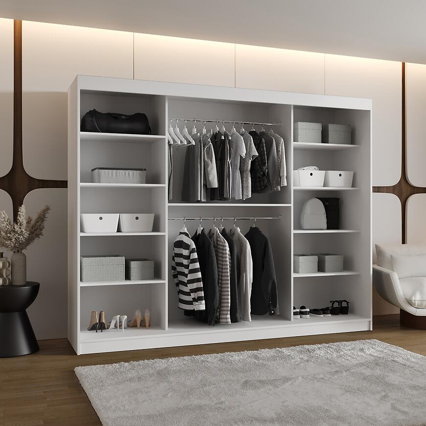 Szafa Spoti 250 biały to idealny wybór dla osób szukających przestronnego, nowoczesnego i funkcjonalnego mebla do sypialni lub garderoby.