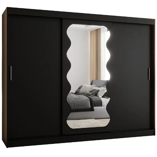 Szafa Spoti 250 w klasycznym czarnym kolorze to propozycja dla osób, które cenią stylowy, nowoczesny design oraz praktyczne rozwiązania w przechowywaniu. Trzydrzwiowa konstrukcja z drzwiami przesuwnymi oraz wbudowanym lustrem zapewnia wygodny dostęp do ubrań i dodatków, a jednocześnie optycznie powiększa wnętrze pomieszczenia.