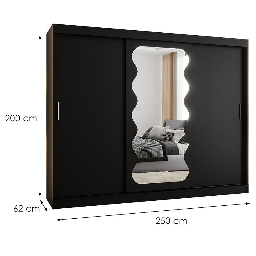 Dzięki wymiarom 200 cm wysokości, 250 cm szerokości i 62 cm głębokości szafa oferuje dużą przestrzeń do przechowywania, jednocześnie drzwi przesuwne umożliwiają łatwe użytkowanie nawet w mniejszych pokojach. Matowe wykończenie frontów i korpusu nadaje meblowi nowoczesnego charakteru, a lustro zwiększa funkcjonalność.