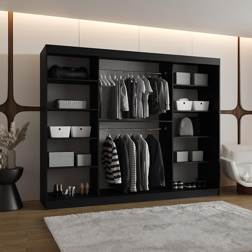 Szafa Spoti 250 czarny to idealny wybór dla osób szukających przestronnego, eleganckiego i funkcjonalnego mebla do sypialni lub garderoby.