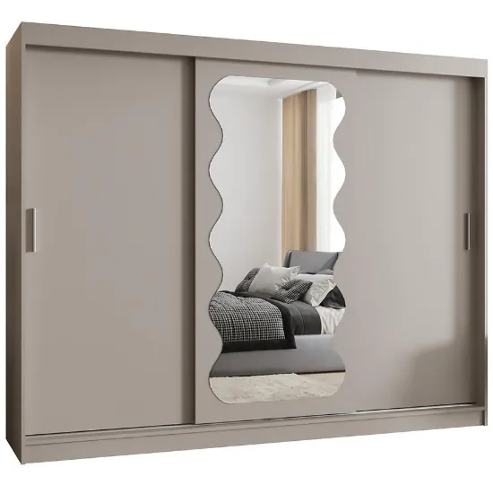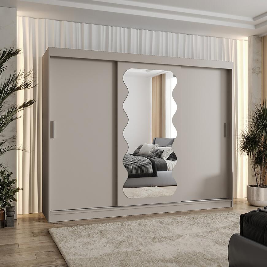 Szafa Spoti 250 w kolorze kaszmir to propozycja dla osób ceniących nowoczesny design i praktyczne rozwiązania w przechowywaniu. Trzydrzwiowa konstrukcja z drzwiami przesuwnymi oraz wbudowanym lustrem umożliwia wygodny dostęp do ubrań i dodatków, a jasne, beżowe wybarwienie optycznie rozświetla wnętrze pokoju.
