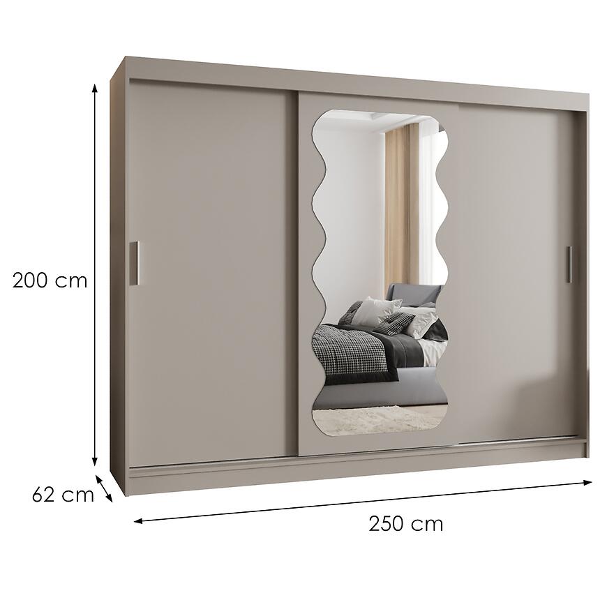 Dzięki wymiarom 200 cm wysokości, 250 cm szerokości i 62 cm głębokości szafa oferuje dużą przestrzeń do przechowywania, jednocześnie drzwi przesuwne pozwalają na wygodne użytkowanie nawet w mniejszych pomieszczeniach. Matowe wykończenie frontów i korpusu nadaje meblowi elegancki, nowoczesny charakter, a lustro zwiększa funkcjonalność szafy.