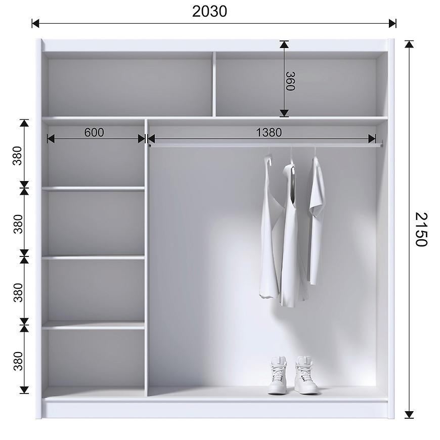 Wnętrze szafy zostało zaprojektowane z myślą o maksymalnej funkcjonalności. Znajduje się w niej drążek na ubrania, który zapewnia miejsce na powieszenie odzieży, oraz półki, idealne do przechowywania ubrań, butów czy innych akcesoriów. Dzięki temu, szafa pozwala na uporządkowanie garderoby w wygodny i praktyczny sposób.