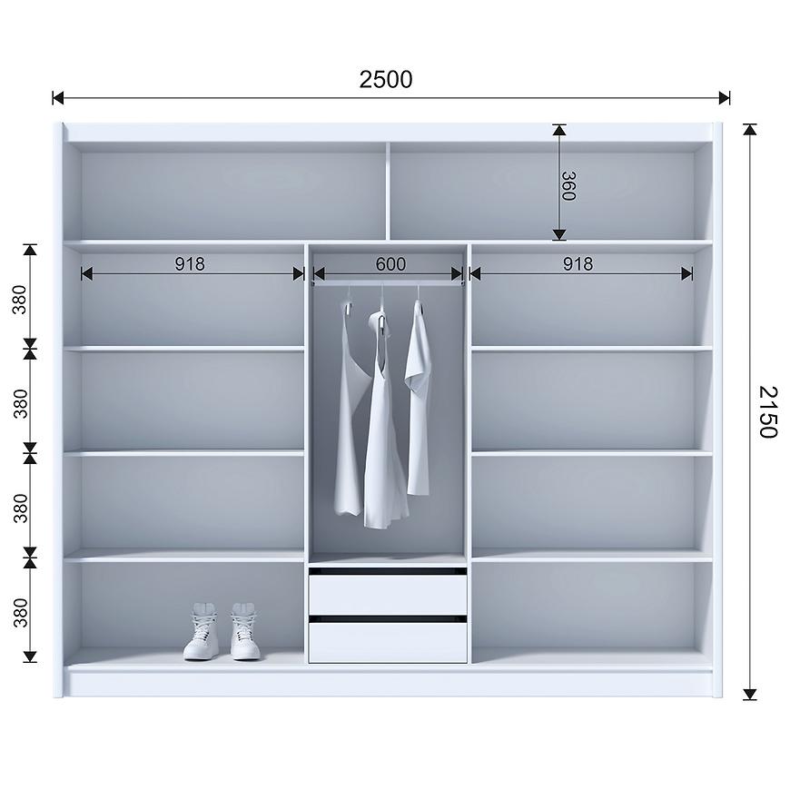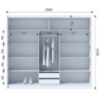 Wnętrze szafy zostało zaprojektowane z myślą o maksymalnej funkcjonalności. Znajduje się w niej drążek na ubrania, który zapewnia miejsce na powieszenie odzieży, oraz półki, idealne do przechowywania ubrań, butów czy innych akcesoriów oraz szuflady. Dzięki temu, szafa pozwala na uporządkowanie garderoby w wygodny i praktyczny sposób.
