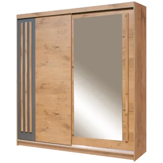 Dzięki drzwiom przesuwnym nie trzeba martwić się o dodatkową przestrzeń przy otwieraniu, a wbudowane lustro zwiększa praktyczność szafy, umożliwiając szybkie sprawdzenie wyglądu. Szafa jest wykonana z laminowanej płyty wiórowej, co gwarantuje trwałość i odporność na codzienne użytkowanie. Waga szafy wynosi 167 kg, co świadczy o solidnej konstrukcji zapewniającej stabilność i długowieczność.