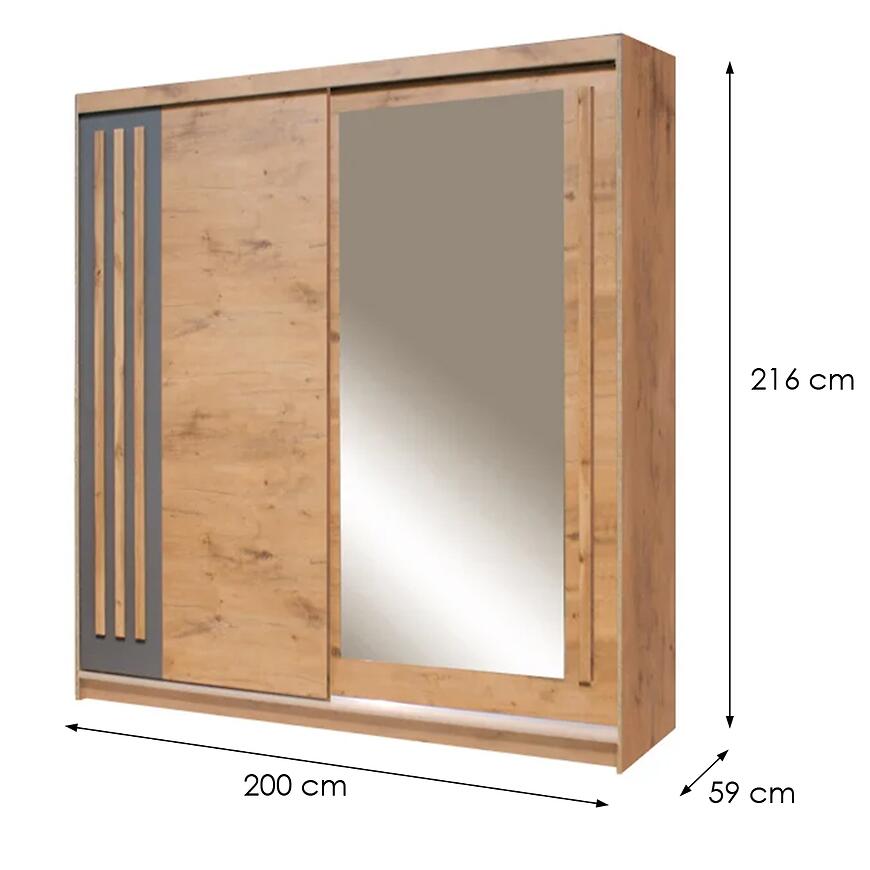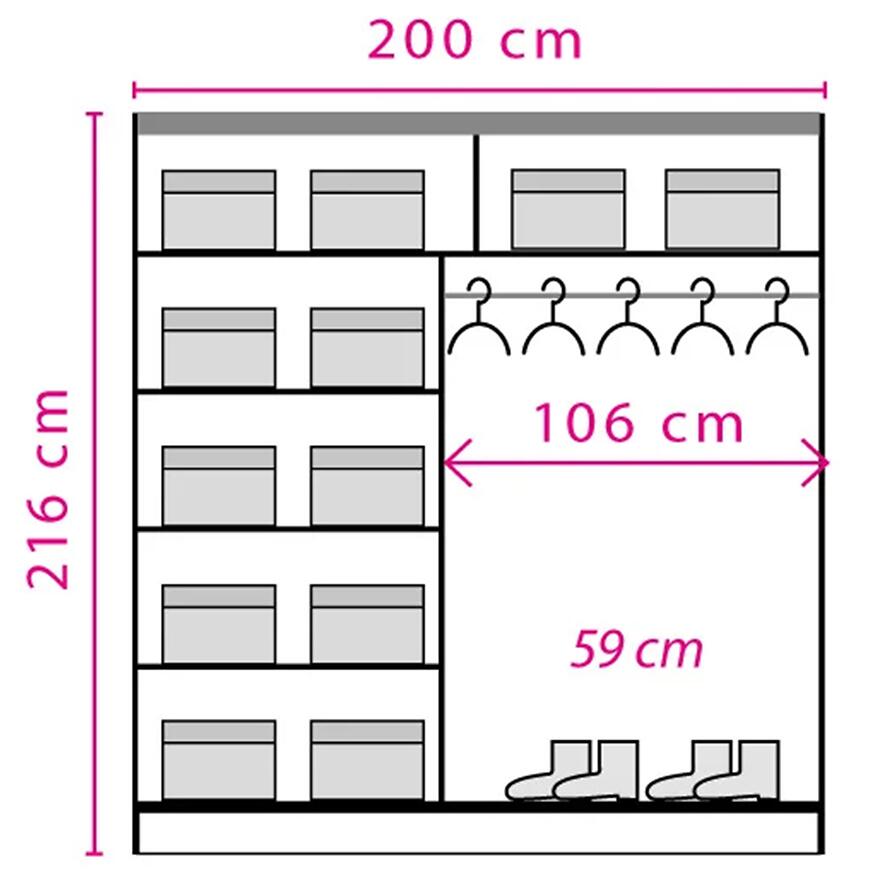 Szafa posiada dwudrzwiowe drzwi przesuwne, które oszczędzają miejsce w pomieszczeniu i zapewniają wygodny dostęp do ubrań oraz akcesoriów. Dzięki wymiarom 200 cm szerokości, 216 cm wysokości i 59 cm głębokości, mebel oferuje dużą przestrzeń do przechowywania garderoby w sposób uporządkowany i przejrzysty.